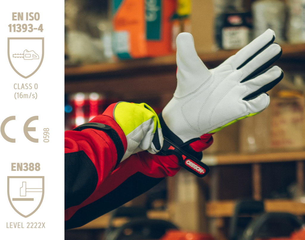 ForestXFiber™ Technologie bietet Schnittschutz für die linke Hand; Stoffe sind ergonomisch integriert für maximalen Komfort bei der Arbeit.
